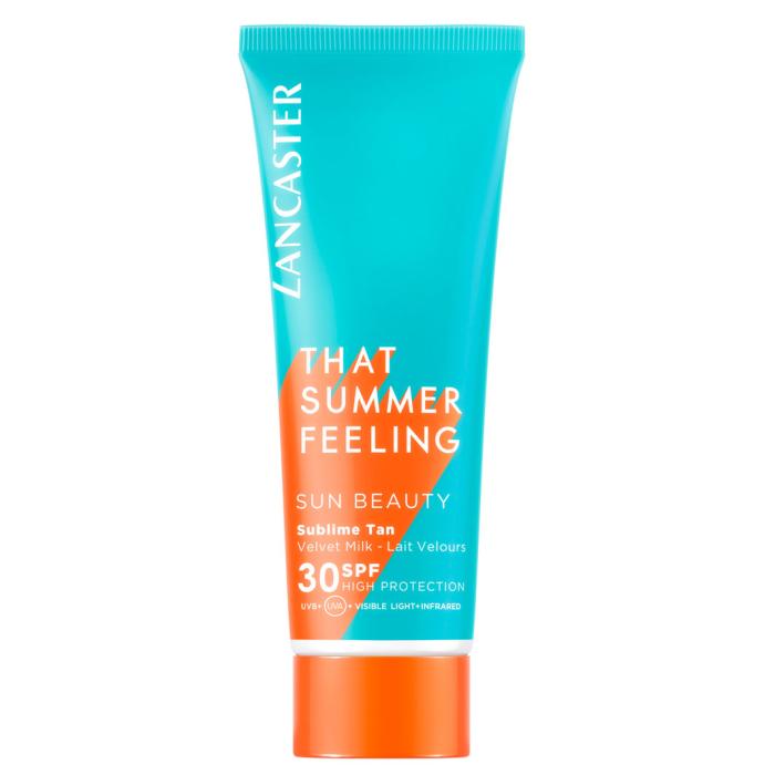 De Sun Beauty Velvet Milk SPF30 is uitgevoerd in oranje en turquoise. De formule zorgt voor een sublieme, goudkleurig bruine kleur en houdt deze tint langer vast. De uitgebreide bescherming, de Full Light Technology, is niet alleen effectief tegen uvb- en uva-stralen, maar het beschermt de huid ook tegen het zichtbare licht en infrarood licht. De Lancaster Limited Edition tubes van 75 ml in reisformaat zijn gemakkelijk mee te nemen en zijn gemaakt van gerecycled materiaal.